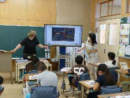 ◆1枚目は3年2組の外国語活動の様子です。学級担任の佐藤先生とALTのレム先生のティームティーチングで,アルファベットの大文字を学習しています。映像を見ながら勉強した後,ABCソングで歌いながら覚えています。