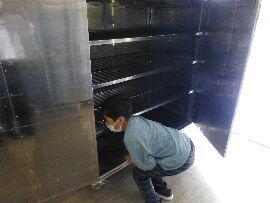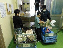 ◆次は,給食後に給食委員会が,クラスの食器等を整理している様子です。用務員の村上さんと一緒に,給食の後片付けをしています。そして,給食センターへの運搬車に積むコンテナの中に,食器や食缶をきれいに入れてくれています。