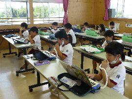 ◆4年生はリコーダーの練習です。曲は「ごんぎつね」。1列おきに立って発表しています。感心したのは,座って聞いている人たちも,発表している友だちの演奏に合わせて,音を立てずに指使いの練習を一生懸命練習していたことです。どんどん上達しますね。