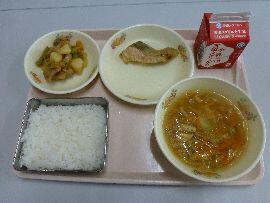 ◆今日の給食は,さけのみそマヨネーズ焼き,にくじゃが,ひきな汁,ごはん,牛乳の計 653kcalでした。毎月第3月曜日は「みやぎ水産の日」です。