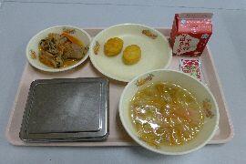 ◆今日の給食は,クリームスープスパゲッティ,チーズオムレツ,はるさめスープ,チョコレートパン,牛乳の計 651kcalでした。