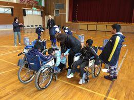 本日は津谷地区社会福祉協議会より三浦様,阿部様にお越し頂き,高齢者体験を実施しました。ウェイトやゴーグルを付けたり,車椅子に乗ったりすることで,高齢者の立場や気持ちを感じることができました。また,高齢者に接する時に大切なこと等を教えて頂きました。