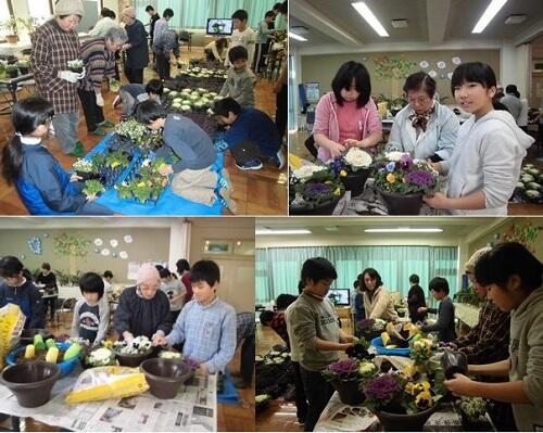 宮城県農林水産部の支援事業である「花育教室」が行われました。本吉響高等学校園芸科が生産・販売している花苗(ハボタン,パンジー,ビオラ,アリッサム)を使い,学校ボランティアのおばあさん方と一緒に寄せ植えを作りました。また,子どもたちは自分の作品を地域のお店や公共施設・福祉施設にプレゼントしました。これからも「ありがとうの花」を咲かせていきたいと思います。