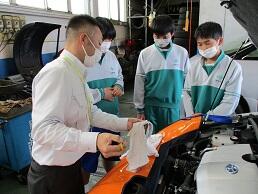 生徒からランニングのときに「危ない」という声が上がっていた敷地内の道路を教職員で補修しました。その隣では,生徒がトウモロコシを植える畑を耕していました。