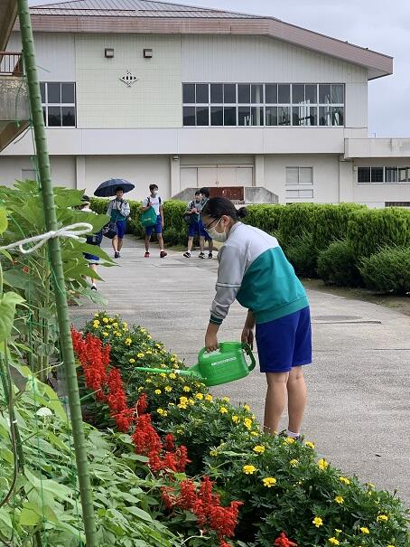 学校前の花壇に,毎朝,整備委員が交代で水遣りをしています。