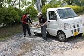生徒からランニングのときに「危ない」という声が上がっていた敷地内の道路を教職員で補修しました。その隣では,生徒がトウモロコシを植える畑を耕していました。