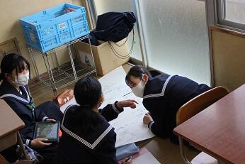 12月の授業参観では全学年ともに,総合的な学習の時間で探究したことについての発表を行います。1年生は福祉について,グループごとに探究活動を行っています。点字機を使って,各教室の表示を点字でつくったグループもあります。
