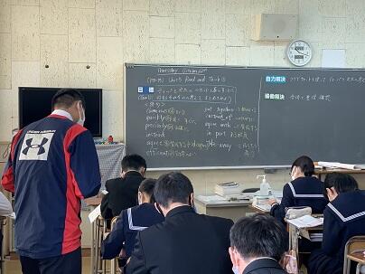 2,3時間目 菅原 茂 気仙沼市長が学校を訪問して,ALTとの英語授業と,総合的な学習の時間の探究学習をご覧になりました。