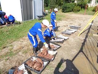 ・水を落とすと遠目にはきれいに見えるプールですが、近くで見てみると、結構汚れが残っています。子供たちには、たわしとデッキブラシでプール側面と底面の汚れをきれいに落としてもらいました。