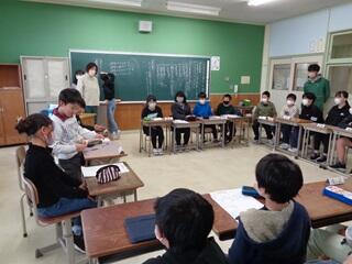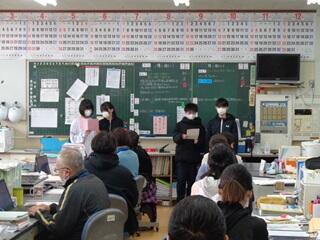 ・6年生が、来春進学する中学校の見学に行きました。始めに、生徒会執行部の生徒から、中学校生活について教えていただきました。その後、中学校の先生の英語の授業を受け、最後に、部活動見学をしました。中学校への期待と楽しみが、膨らんだようでした。