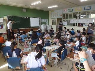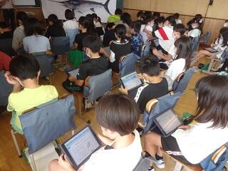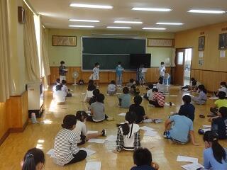 ・1時間目は,はじめに全校集会を行いました。校長先生から,「1学期後半は,『心を磨く』ことを頑張ってほしい。友達と仲良く生活すること,また,一日一回,誰かに喜んでもらえることをして,自分の心を磨いてほしい。」というお話がありました。