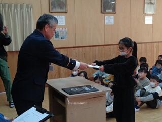 ・最後は、代表児童が修了証をいただきました。学んだことを、日々の生活の中に確実に生かし、火災予防等に努めてほしいと思います。