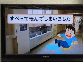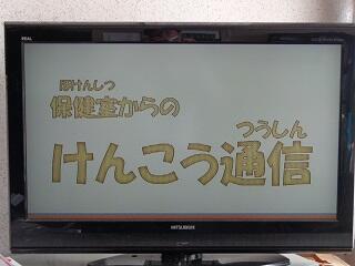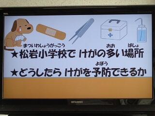 ・今日の給食時間に,校内放送で「けんこう通信」を行いました。テーマは,「けがの予防」です。学校生活では,不注意等によるけがが少なくありません。どんなことに気を付ければ,不注意によるけがが減るのかを養護教諭がスライド資料を作成し,子供たちに説明しました。