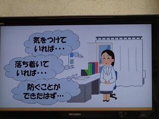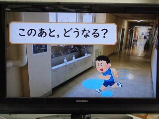 ・廊下や校舎前のコンクリートの疾走によるけが,教室内でふざけて遊んでいた時のけがなど,具体的な例を挙げながら説明しました。「この後どうなるか?」と子供たちに疑問を投げ掛け,考えさせる場面もありました。