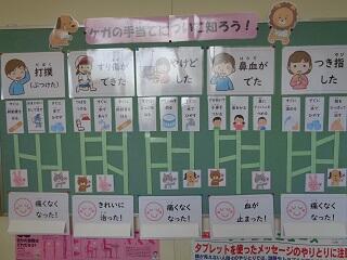 ・保健室前には,自分でできる処置の方法を紹介しています。あみだくじになっており,どの方法が正しい対処方法かを考えさせる工夫がしてあります。子供たちは,「こっちなんだ」などとつぶやきながら掲示物を見て,正しい対処法について学んでいました。