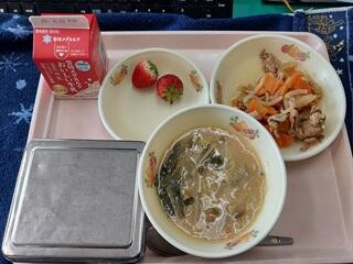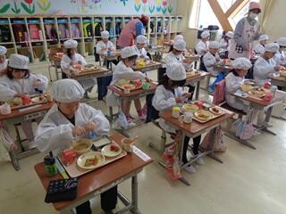 ・今日は、担任の先生から、配膳の仕方等について教えていただいた後、みんなで元気に「いただきます。」をしました。好き嫌いなくたくさん食べて、体も心もぐんぐん成長してほしいと思っています。