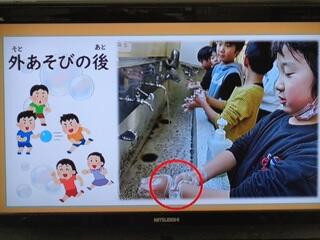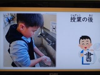 ・外遊びの後、給食の前、掃除の後、授業の後など、それぞれの場面で上手に手洗いしている子供の様子を写真で紹介しながら、手洗いの大切さについて伝えました。最後には、ハンカチをきちんと持ってきている子供たちの紹介もありました。