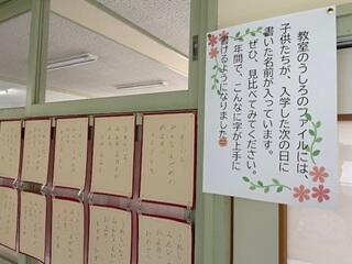 ・明日の学習参観に向け、今年度の書きぞめ作品を各学年で展示しています。1年生は、4月に書いた自分の名前と比べ、その成長が分かるように工夫して展示しています。
