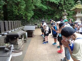 ・初めの見学先は飯盛山です。猪苗代湖から飯盛山につながる堀,さざえ堂,白虎隊の墓等を見学しました。さざえ堂の前で学級ごとに記念撮影を行いました。