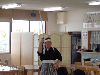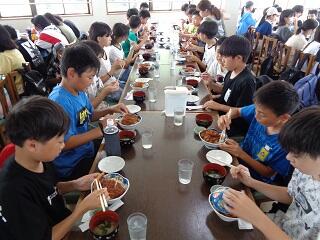 ・飯盛山見学後は,修学旅行最初のお昼御飯です。メニューは,会津名物ソースかつ丼でした。丼のふたを開けた途端,子供たちからは「おいしそう~」の声が上がっていました。完食した子が多かったようです。白虎隊の踊りも見せていただきました。