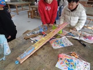 ・グループで協力しながら作りました。板に釘を打ち付け、ビー玉が転がり落ちないようにひもを付け、釘にはじかれながら坂を下っていくコースターに仕上げました。