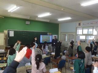 ・映像資料を基に,野口英世の一生について詳しく教えていただきました。子供たちが,メモを取りながら真剣に話を聞いていました。修学旅行が,一段と楽しみになったようです。