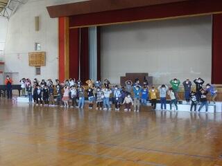 ・1年生の子供たちは,6年生の子供たちと手をつなぎ,満面の笑みで入場してきました。2年生以上の子供たちは,ダンスを踊ったり,演技をしながら学校の行事を紹介したり,自分たちの得意な技を紹介したりと,1年生の子供たちに喜んでもらおうと工夫した出し物を行っていました。1年生からは,かわいいダンスのお返しがありました。全校みんなで踊りました。