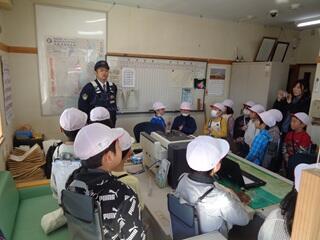 ・駐在所では、おまわりさんがどんな仕事をしているのかを教えていただいたり、パトカーの中や装備品等を見せてもらったりしたので、子供たちは興味津々でした。教えていただいたことをしっかりとメモしていました。