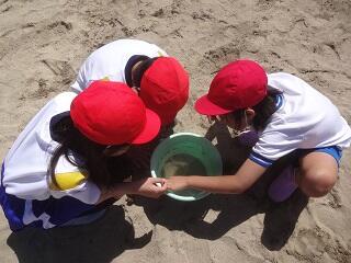 ・まずは,浜に流れ着いている大きなプラスチックごみをみんなで探しました。その後,砂をふるいに掛け,海水を加えます。砂のように重い物は,どんどん沈んでいきますが,プラスチックや発泡スチロールが細かくなったマイクロプラスチックは沈みません。子供他ちっは「これがそうかもしれない」と話しながら,確認していました。