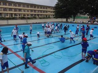 ・今日,プール清掃を行いました。プール内は,高学年の子供たちが行いました。5年生は,プールサイドとプール内壁面を,6年生は,プール内の底面を掃除しました。