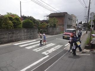 ・1・2年生は,実際に学校周辺の道路を歩行しながら,車の確認の仕方,横断歩道の渡り方,道路の歩き方等について交通指導隊の皆さんから教えていただきました。