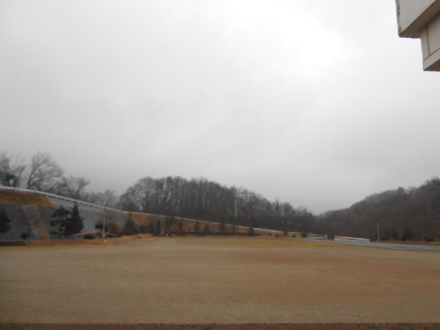 風はありませんが、雪が舞ってきました。校庭はうっすらと白くなっています。