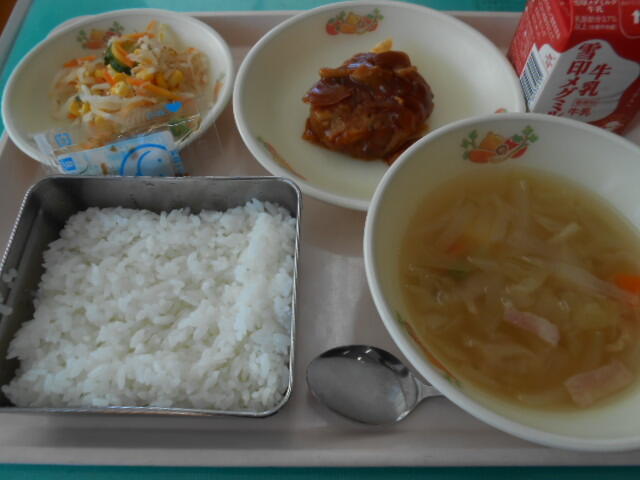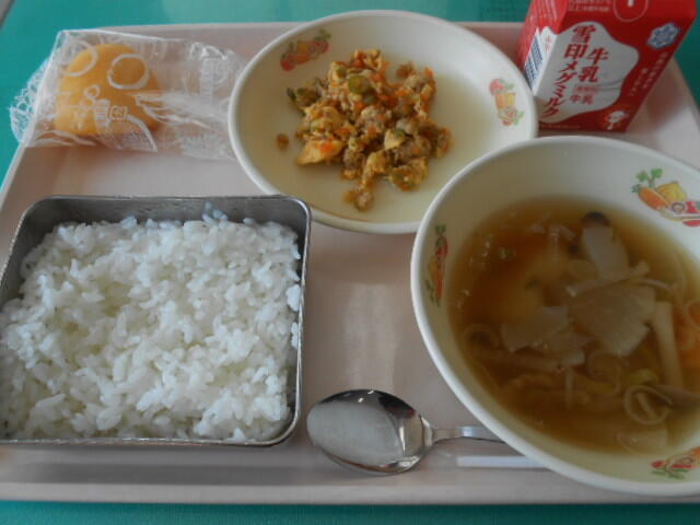 主なメニュー:クリームスープスパゲティー、ツナサラダ、お米のババロア、金時豆パン