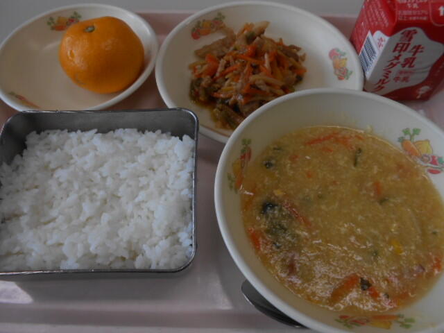 主なメニュー:チンジャオロースー、コーン入り卵スープ、みかん