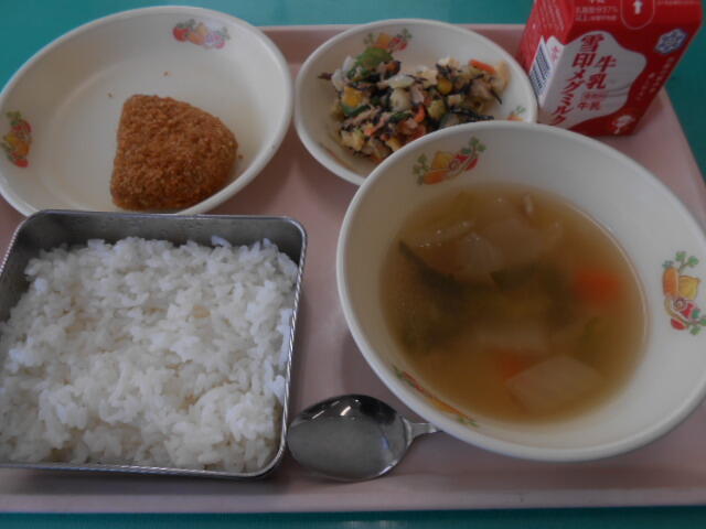主なメニュー:かぼちゃコロッケ、ひじきのサラダ、野菜と豆のスープ