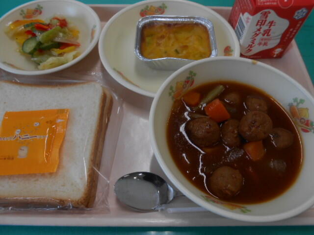 主なメニュー:食パン、ホイップハニージャム、肉団子のデミグラスソース煮、かぼちゃグラタン、イタリアンサラダ