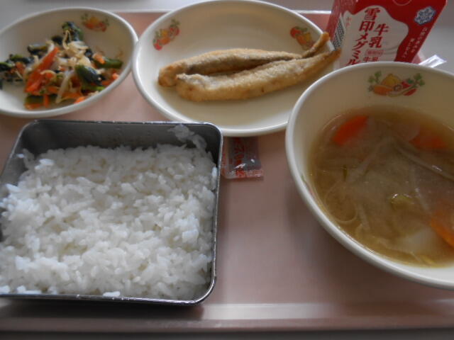主なメニュー:ししゃもフライ(2本)、パックソース、小松菜のおひたし、さつま汁