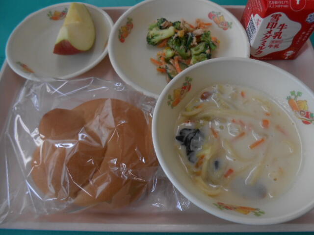 主なメニュー:クリームスープスパゲッティー、ブロッコリーサラダ、りんご、ミルクパン