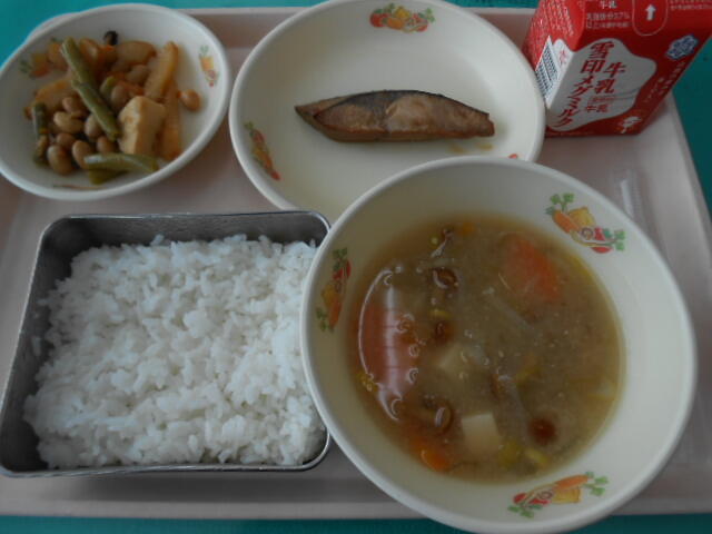 主なメニュー:ぶりの照り焼き、ごもく豆、なめこ汁