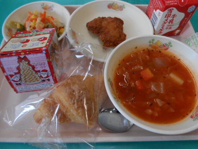 主なメニュー:クロワッサン、クリスピーチキン、コーンサラダ、ミネストローネスープ、クリスマスケーキ
