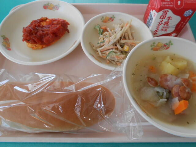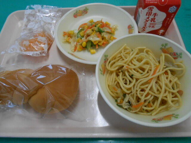 主なメニュー:ツイストパン、和風スパゲティー、フレンチサラダ、冷凍もも