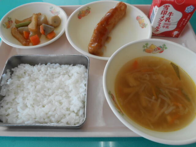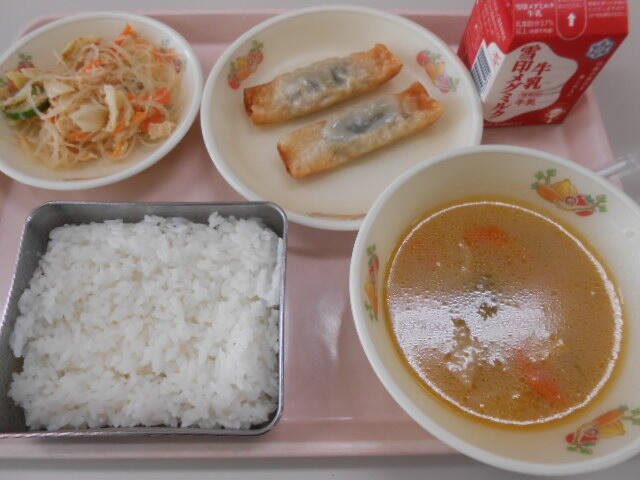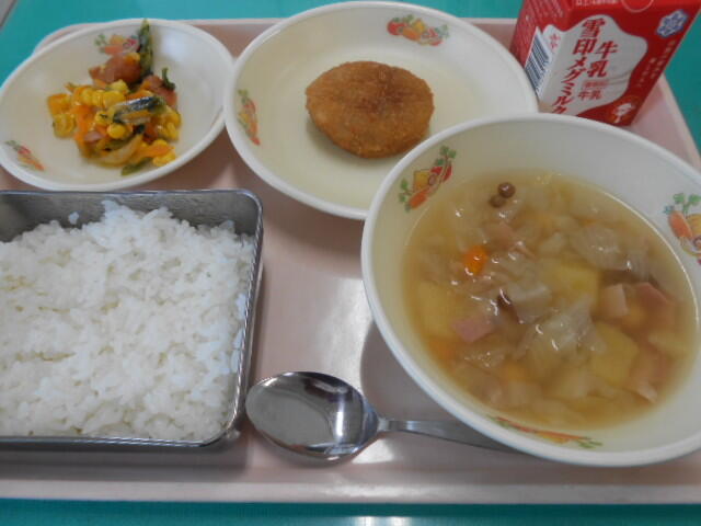 ミネストローネスープと言えば、マカロニが入っているイメージがあると思いますが、今日は、マカロニの代わりにもち米の玄米を使いました。プチッとした食感を楽しみましょう。(給食センターたよりより 一部抜粋)
