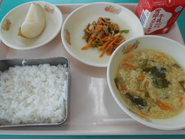 主なメニュー:チンジャオーロースー、中華風たまごスープ、梨