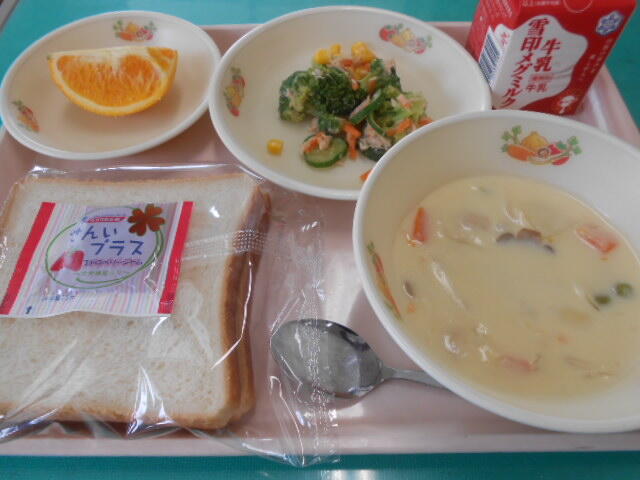 主なメニュー:食パン2枚、ホワイトシチュー、ブロッコリーサラダ、オレンジ