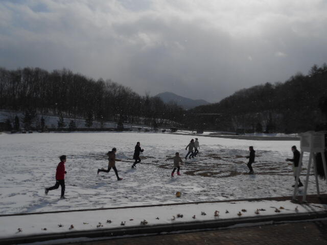 校庭にはまだ雪が残っています。学生ボランティアも混じって「ドロ警」です。