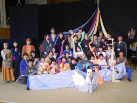 全校児童は20名です。一つの発表の間中、出演が続くことに加え、多くのせりふ、そして、係の仕事と大変な忙しさの中での発表になりました。しかし、一人一人の児童は精一杯演じ、歌い、頑張りました。場数を踏んだ演技は、観客の皆様の笑いや涙を誘う場面もありました。