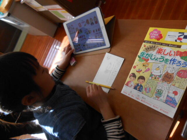低学年 大好きなおじいちゃんに年賀状を書いています。