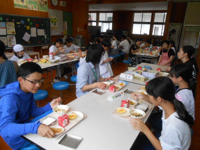 給食タイム 縦割り班で カモシカも来ました