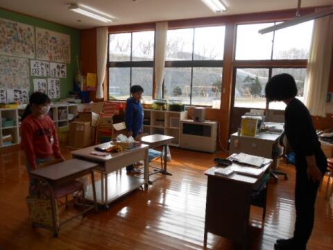 卒業を目前に控えた6年生4名と校長・教頭・担任が校長室で一緒に給食をいただきました。