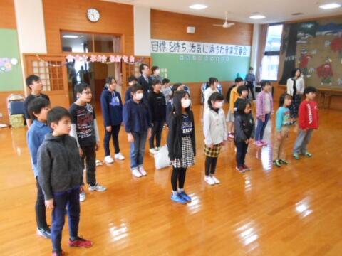 4月から最上級生になる5年生は、一人一人壇上で決意を述べました。「学校を支える一つの柱になる。」「卒業生のように立派になる。」「1年間自主学習として日記を書き続けた。文章をうまくなりたい。」「6年生としてリードし、立派な学校をつくる。」「予習・復習を毎日できた。6年生でも続けたい。」「行事でいい結果を残したい。」「みんなをまとめたい。5分前行動など意識したい。」